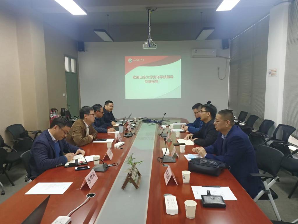 在上海海洋大学海洋科学学院,学院党委副书记石张东,副院长胡松、陈锦涛代表海洋科学学院对黄建军、张伟一行的到访表示热烈欢迎。胡松详细介绍了海洋科学学院在一流专业建设、本科生培养、师资队伍建设等方面的情况。陈锦涛介绍了实验室建设、管理方面的情况。沈蔚教授介绍演示了海洋类虚拟仿真实验教学平台情况。张伟介绍了山东大学yl9193永利官网在历史沿革、专业建设、学生规模、科学研究方面的基本情况。黄建军从强化合作、专业建设和教师队伍建设等方面进行了交流,希望以此次座谈为契机,进一步加强两院间实际合作,相互借鉴,共同提高。